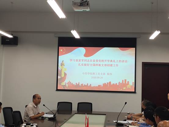 9月29日晚,支部书记蔡伟以《学习袁家军同志在省委党校开学典礼上的讲话——扎实做好全国样板支部创建工作》为题,结合公司教工党支部“第二批全国样板支部”创建工作开展的具体情况分享了学习袁家军同志讲话的感悟。他希望全体教师党员按照“五好”优秀共产党员的标准,积极发挥头雁效应,并通过示范引领作用,促进公司各项事业又好又快发展。