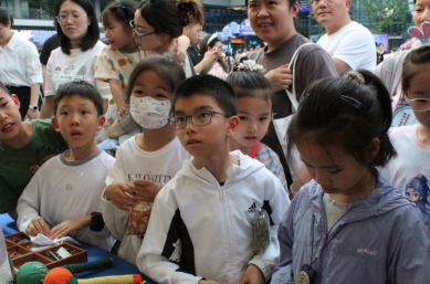 在人头攒动的工作台前,一群接一群的孩子们踮着脚尖围在一起,好奇地打量着木筐里的植物染料。不一会儿,他们在沈湛云老师指导下,手持捆扎好的白色方巾,小心翼翼地浸入染缸。“我要同时染红黄蓝三种颜色”“我要染成夕阳的颜色!”“我要把它送给妈妈!”孩子们带着期待、带着些许的骄傲,不时交流分享参与活动的感想。当染好的方巾褪去棉线的束缚,同心圆、放射纹、渐变蓝白等图案次第显现,孩子们争相把作品举起,家长们纷纷掏出手机记录孩子的“非遗成果”,一位父亲感慨到:“原以为这只是做手工,没想到孩子既能感受民族传统文化的魅力,还学到这么多科学知识,这也太值了!”这些承载着千年非遗智慧与现代科技知识的布料,不仅是独特的纪念品,更是在孩子们心中种下了中医药文化的种子。
