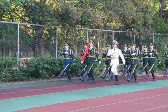 清晨7:20,12名英姿飒爽的旗手们迎着朝阳,迈着铿锵有力的步伐庄严地护送五星红旗至国旗台下。在全场师生激昂的国歌声中,鲜艳的五星红旗冉冉升起,全场庄严地行注目礼,每个人都心潮澎湃,爱国强国、爱校荣校情怀油然而生。