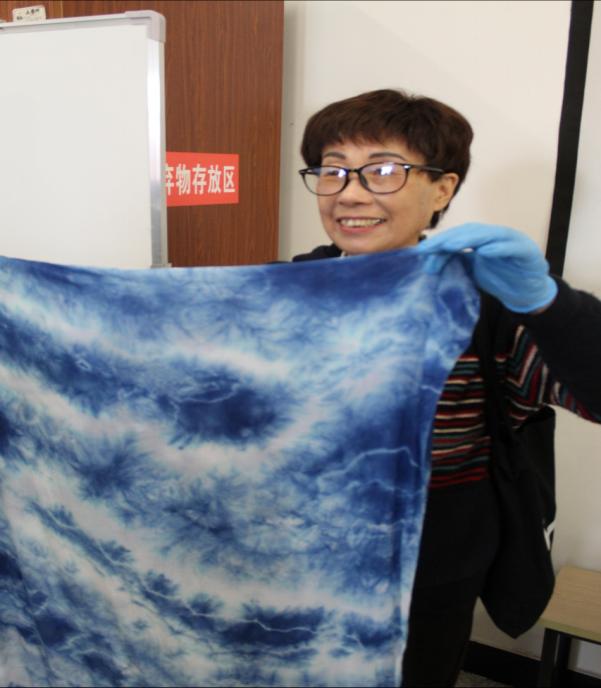 图9:张阿姨向我们展示她制作的中药扎染围巾