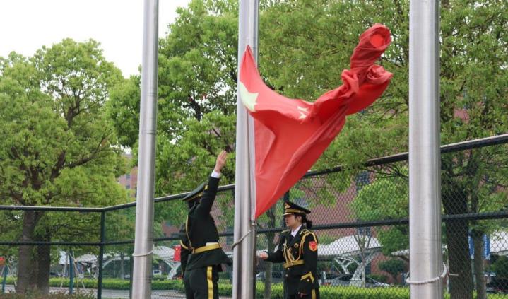 清晨7:20,升旗仪式正式开始,旗手们迎着朝阳迈着铿锵有力的步伐庄严地护送五星红旗至国旗台下。在全场师生激昂的国歌声中,鲜艳的五星红旗冉冉升起,全场庄严行注目礼,每个人都心潮澎湃,爱国、强国情怀油然而生。