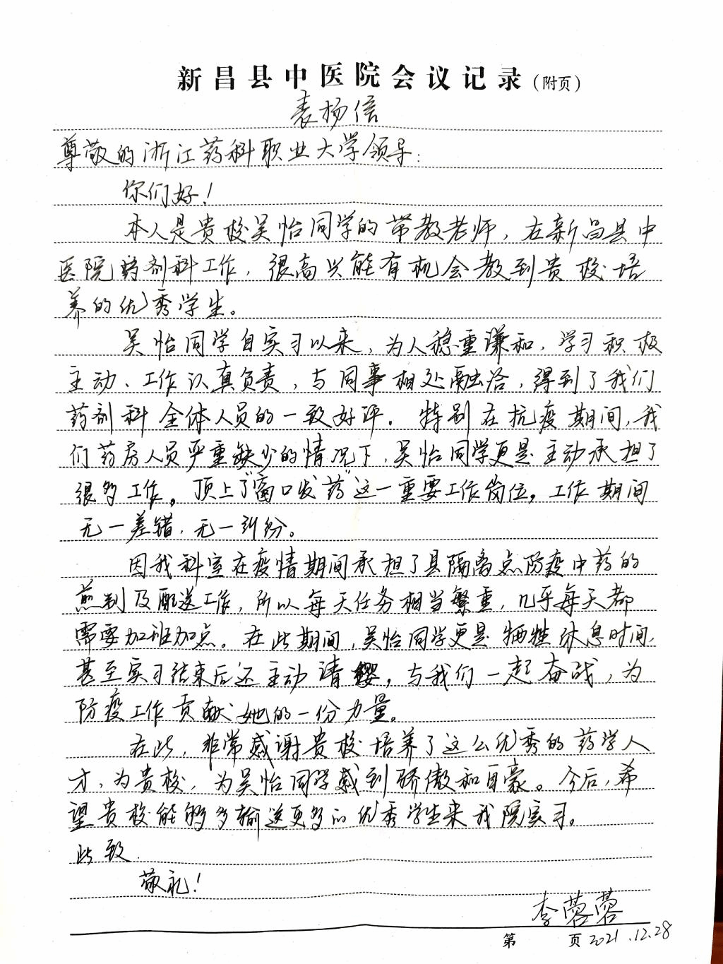 2021年12月28日,公司m88官网辅导员侯楠楠收到新昌县中医院发来的一封表扬信,信中不惜热情洋溢赞美之词表扬了公司m88官网2019级中药学9班吴怡同学。赞赏她在新昌县中医院实习中,积极工作,主动请缨,加班加点,始终坚持在防疫抗疫第一线,为防疫工作贡献了青春力量。