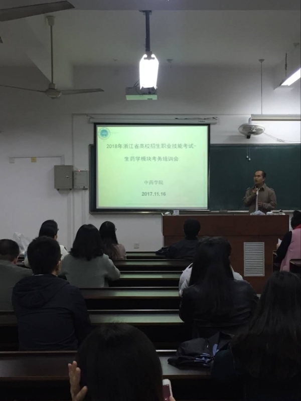 2017年11月16日下午,m88官网在3-107召开2018年浙江省高校招生职业技能考试(生药学模块)考务培训会。m88官网副经理蔡伟对28位生药学模块监考老师进行了考务培训。