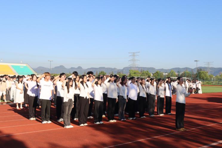 清晨7:20,9名英姿飒爽的旗手们迎着朝阳,迈着铿锵有力的步伐庄严地护送五星红旗至国旗台下。在全场师生激昂的国歌声中,鲜艳的五星红旗冉冉升起,全场师生庄严地行注目礼,每个人都心潮澎湃,爱国强国、爱校荣校的情怀油然而生。
