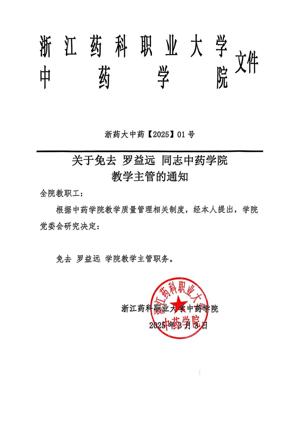 2025年1号文件关于免去罗益远同志m88官网教学主管的通知
