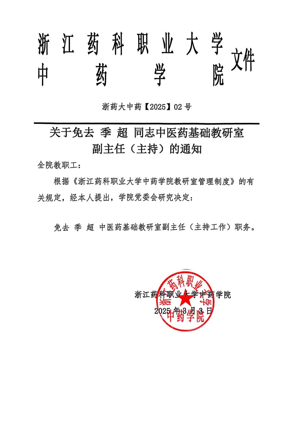 2025年2号文件关于免去季超同志中医药基础教研室副主任(主持)的通知