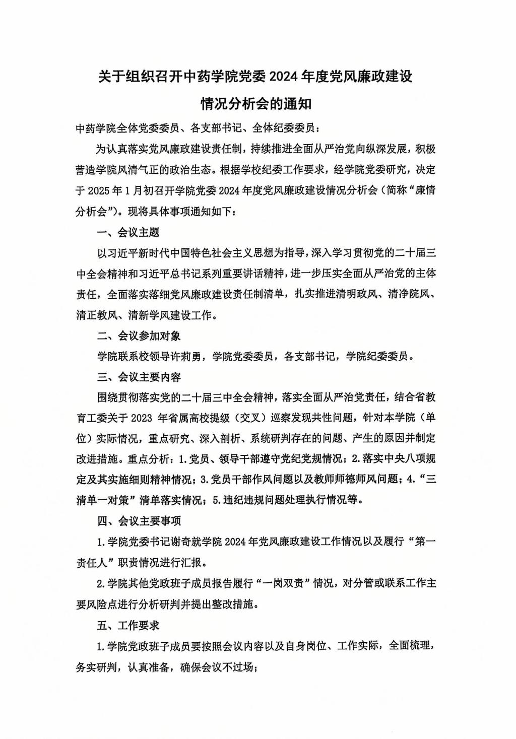关于组织召开公司党委2024年党风廉政建设情况分析会的通知