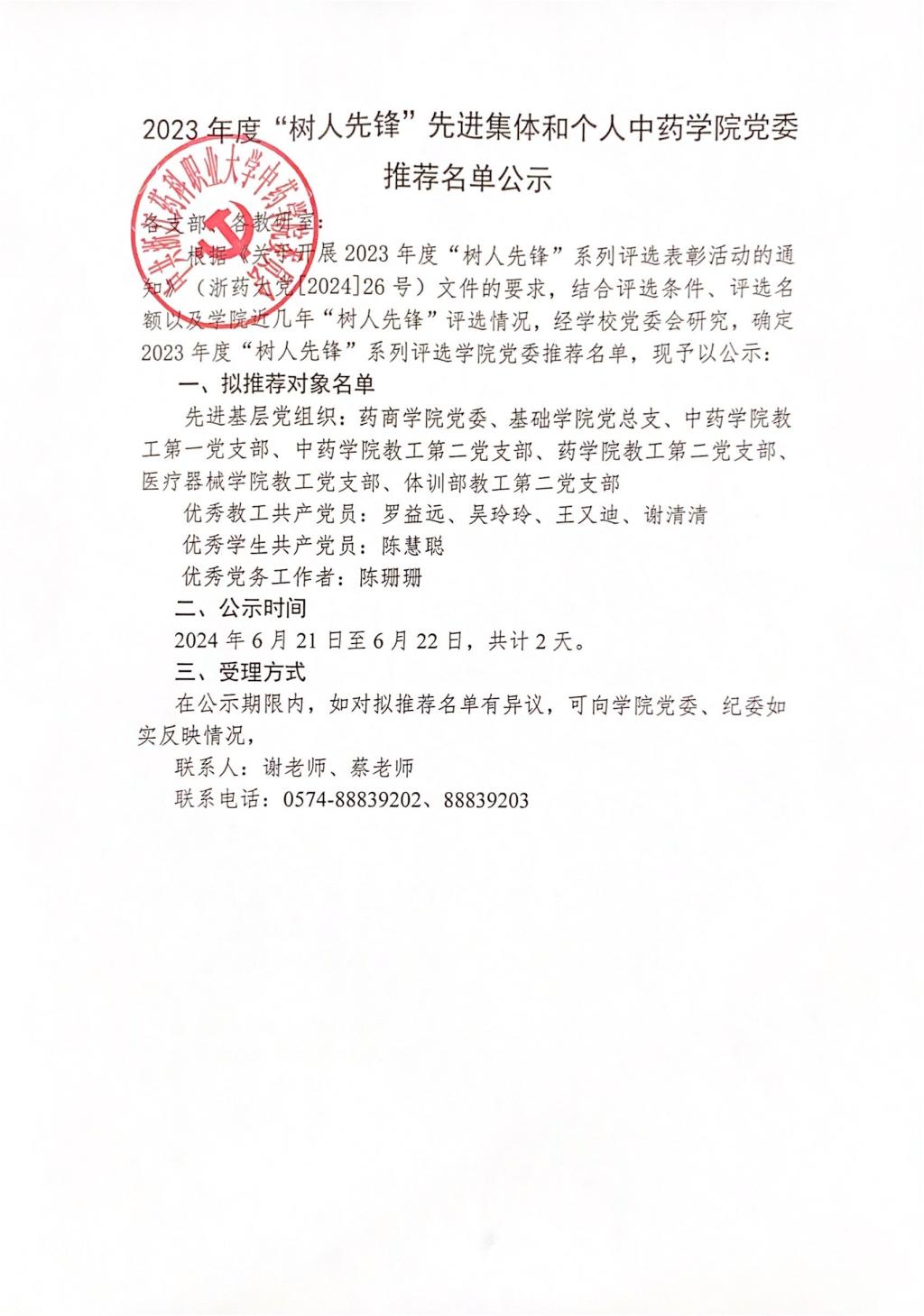 2023年度“树人先锋”先进集体和个人公司党委推荐名单公示