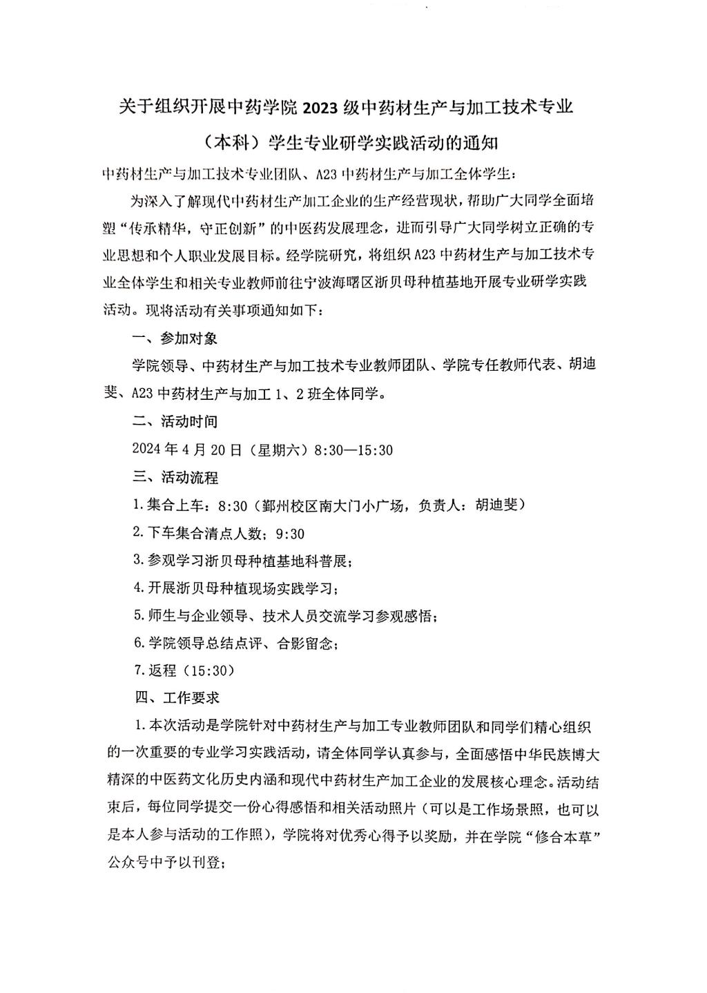 关于组织开展m88官网2023级中药材生产与加工技术(本科)员工专业实践研学活动的通知