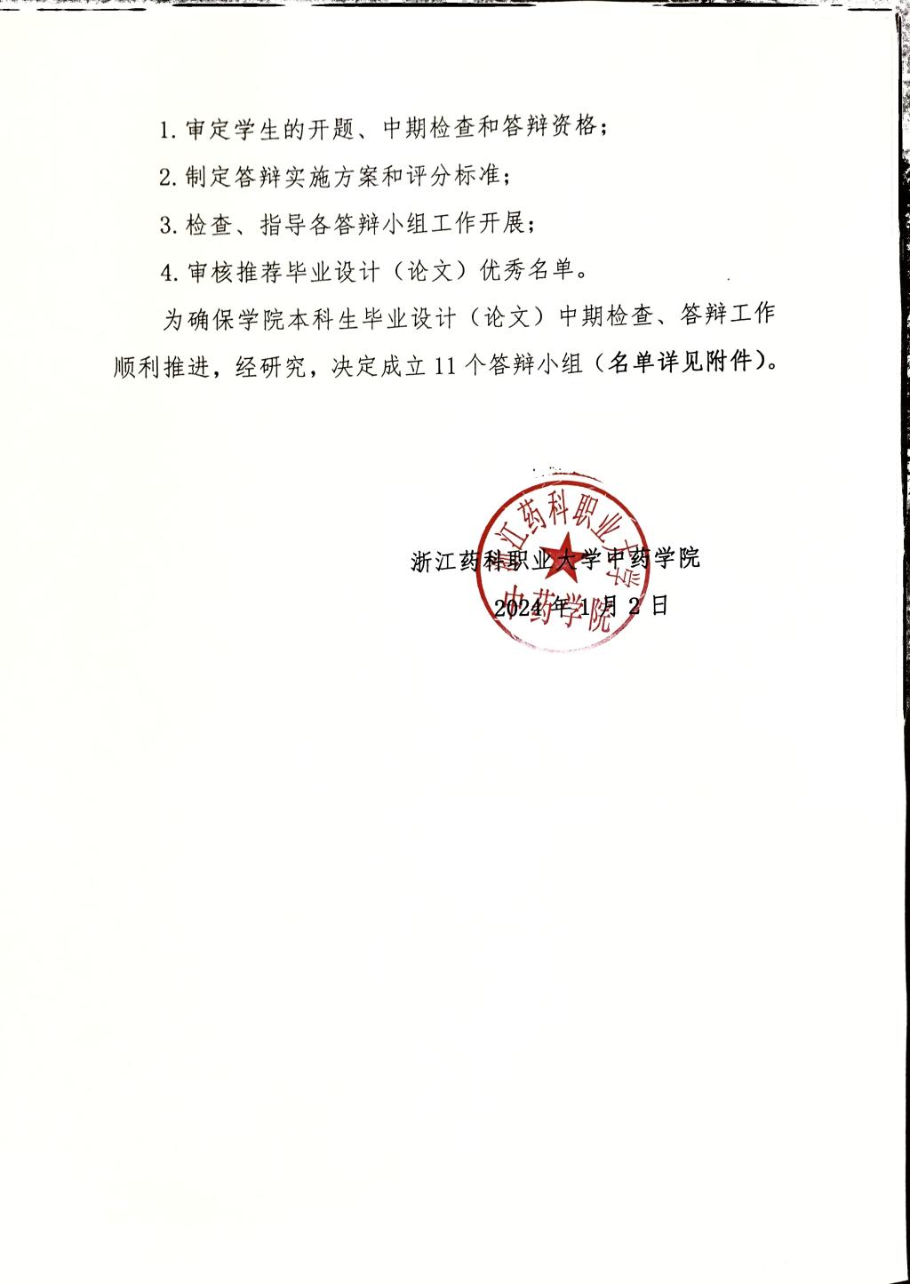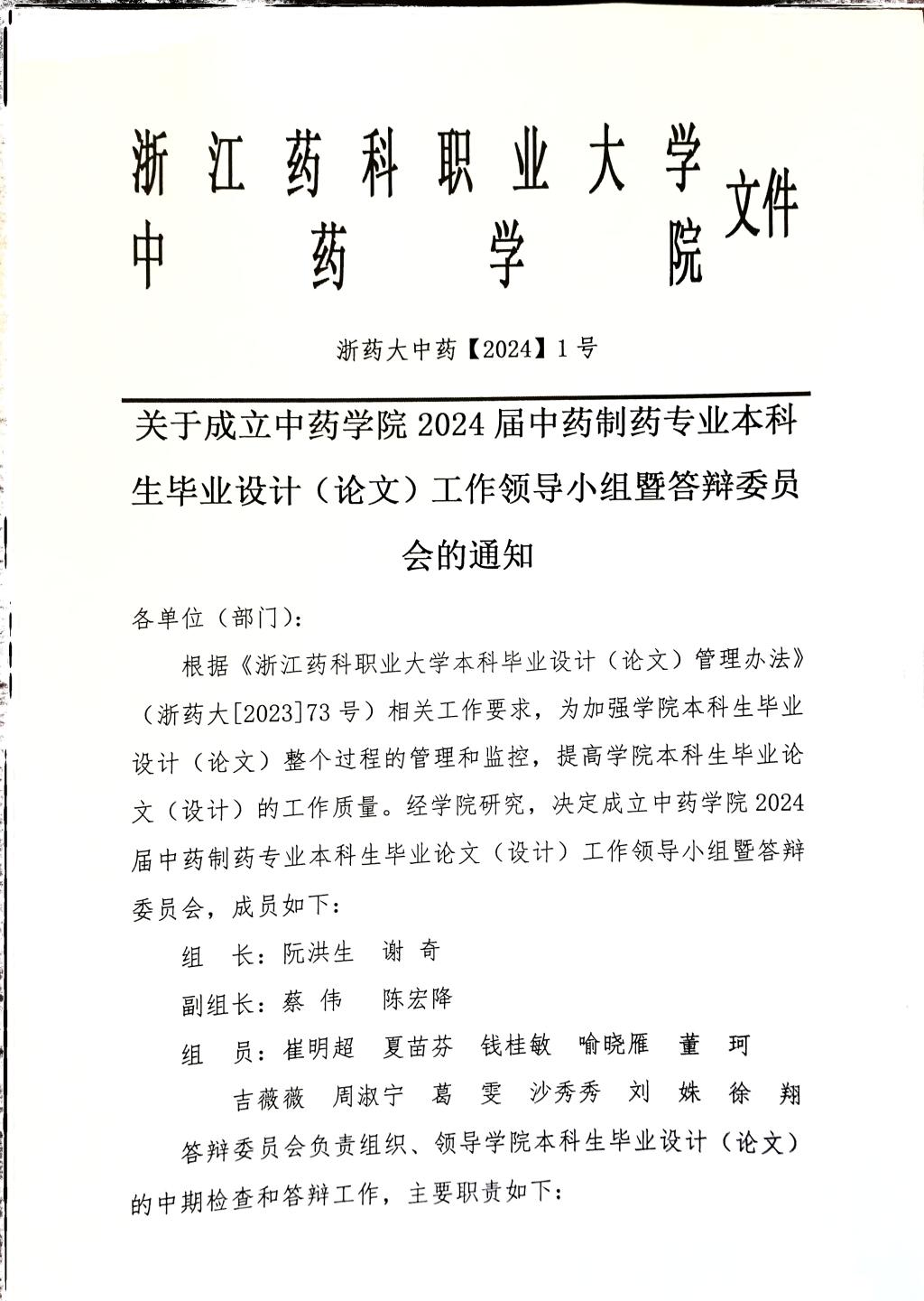 2024年1号文件关于成立m88官网2024届中药制药专业本科生毕业设计(论文)工作领导小组暨答辩委员会的通知