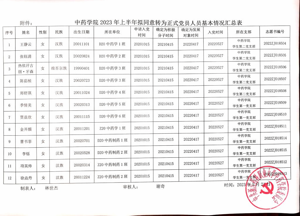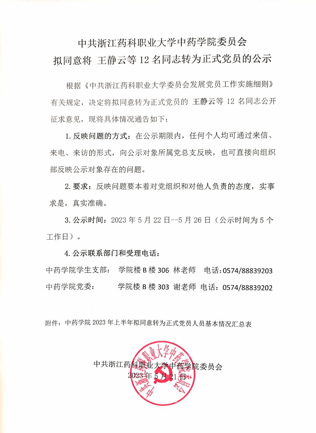 中共药科职业大学m88官网委员会拟同意将 王静云 等12位同志转为正式党员的公示
