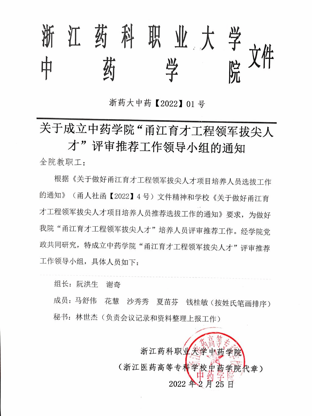 关于成立m88官网“甬江育才工程领军拔尖人才”评审推荐工作领导小组的通知
