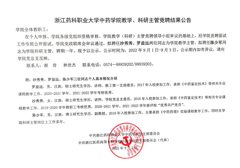 关于聘任葛雯同志为m88官网中药化学与检测教研室负责人的公告