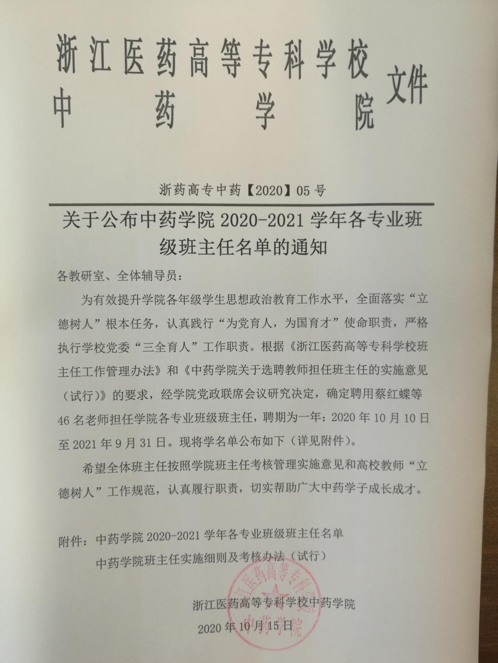 关于公布m88官网2020-2021学年各专业班级班主任名单的通知